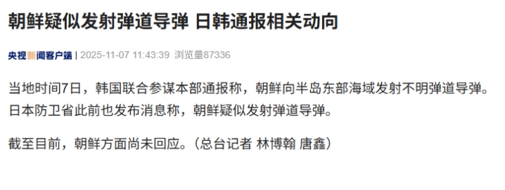 当地时间7日,韩国联合参谋本部通报称,朝鲜向半岛东部海域发射不明弹道导弹。日本防卫省此前也发布消息称,朝鲜疑似发射弹道导弹。