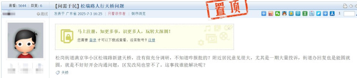 据市民留言内容显示,松岗街道满京华小区松瑞路新建天桥在建设前未开展充分民意调研,项目报批流程存在疑点。周边居民特别是小区一期业主此前进行过多次投诉,但属地街道办及区级发改部门均无法有效解决问题。